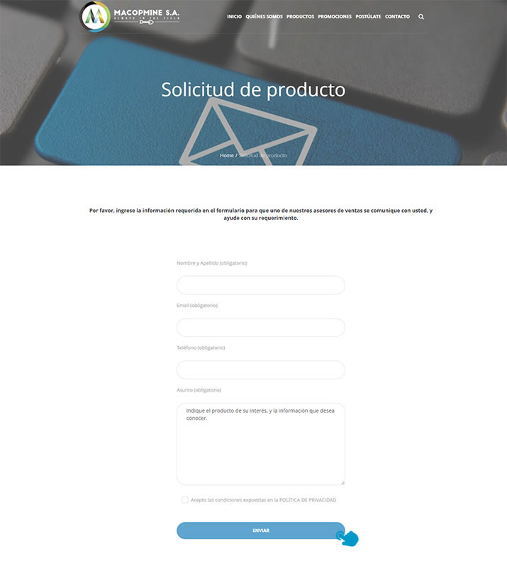 - Ingrese la información solicitada en todos los campos, y haga check para aceptar la Política de Privacidad. Luego, presione el botón ENVIAR para que los datos sean recibidos por nuestros asesores de ventas, y uno de ellos se comunique con usted para procesar el requerimiento.